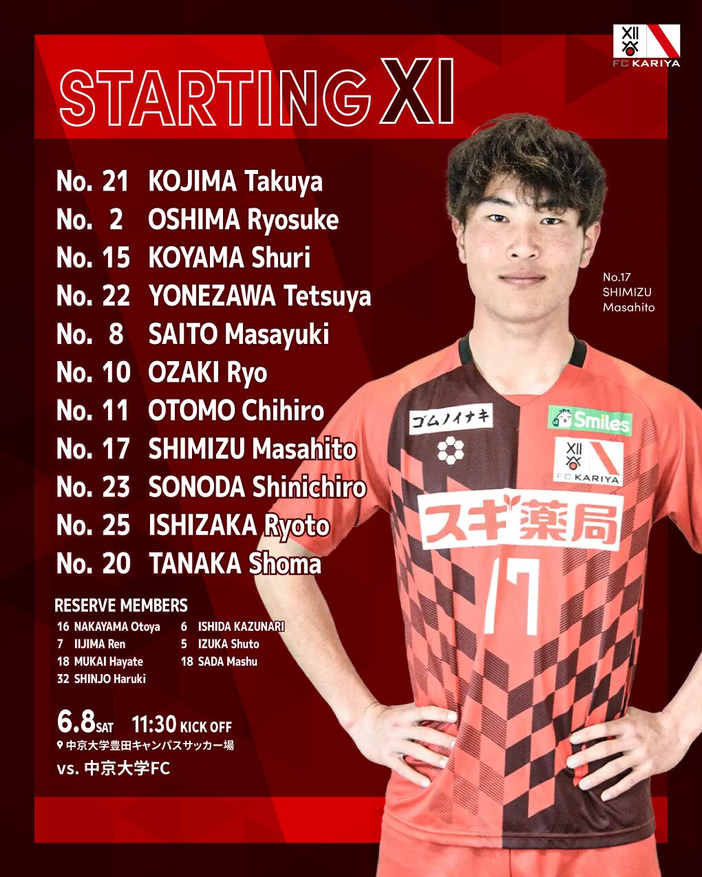 6/8(土)に行われました東海社会人サッカーリーグ1部 中京大学FC戦の試合結果をお知らせいたします。