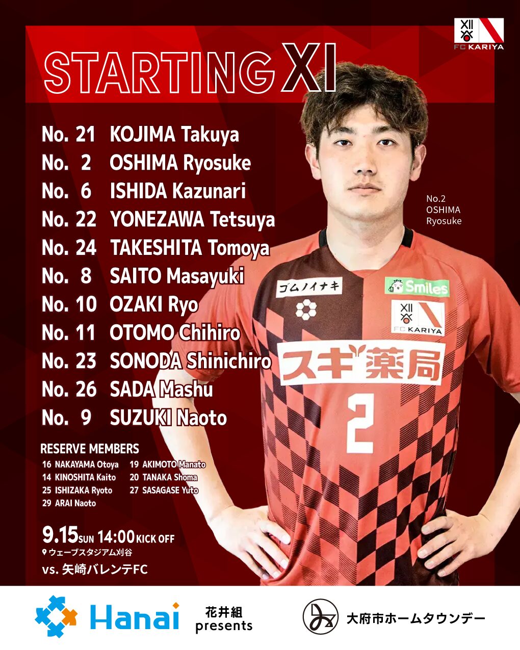 9/15(日)に行われました東海社会人サッカーリーグ1部 花井組 presents マッチ大府市ホームタウンデー矢崎バレンテFC戦の試合結果をお知らせいたします。 試合結果 FC刈谷 2-1 矢崎バレンテFC (前半1-0/後1-1) ▪得点者 24分 大友千裕 67分 米澤哲哉 スターティング11 来場者数 2,030名