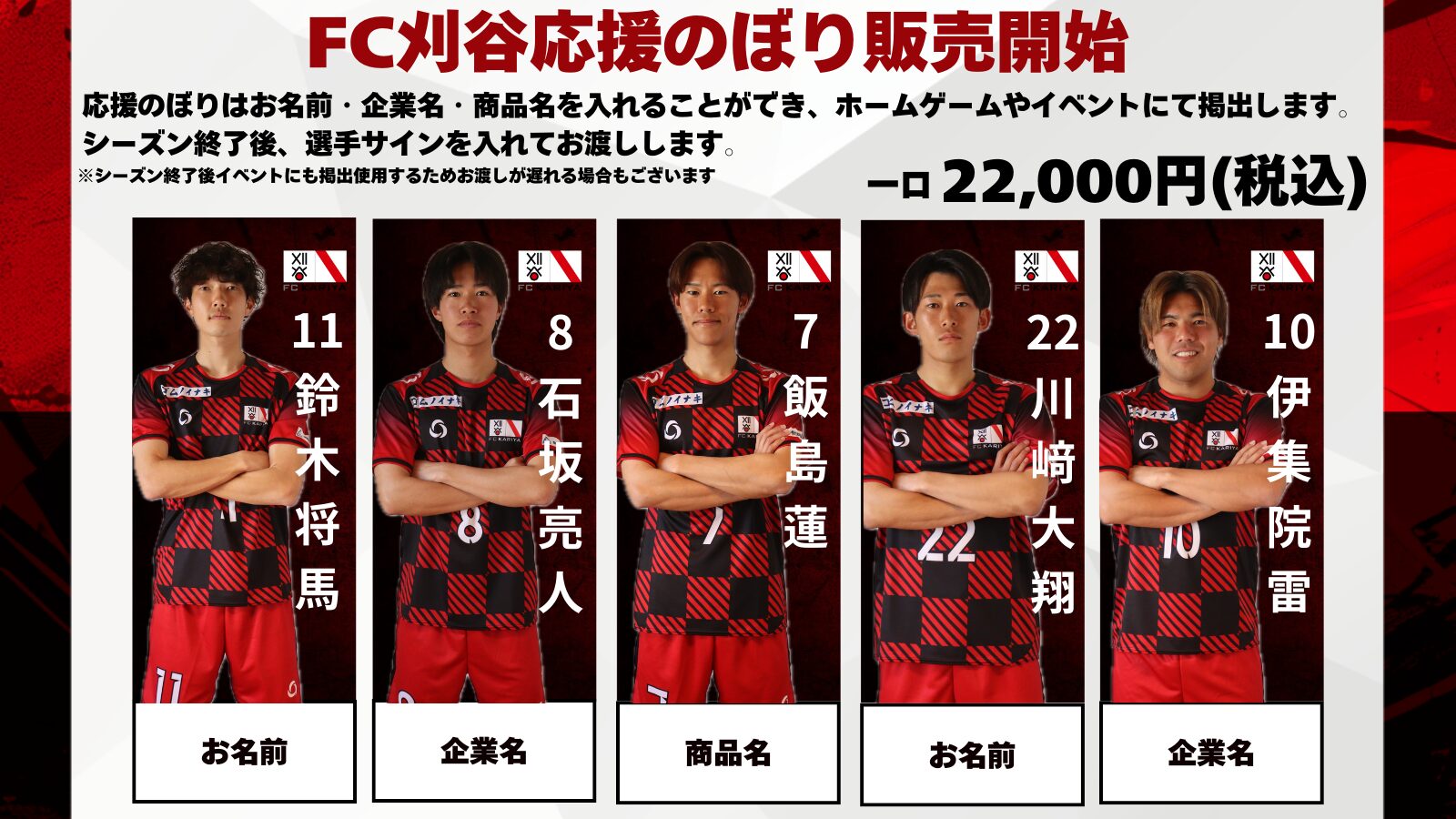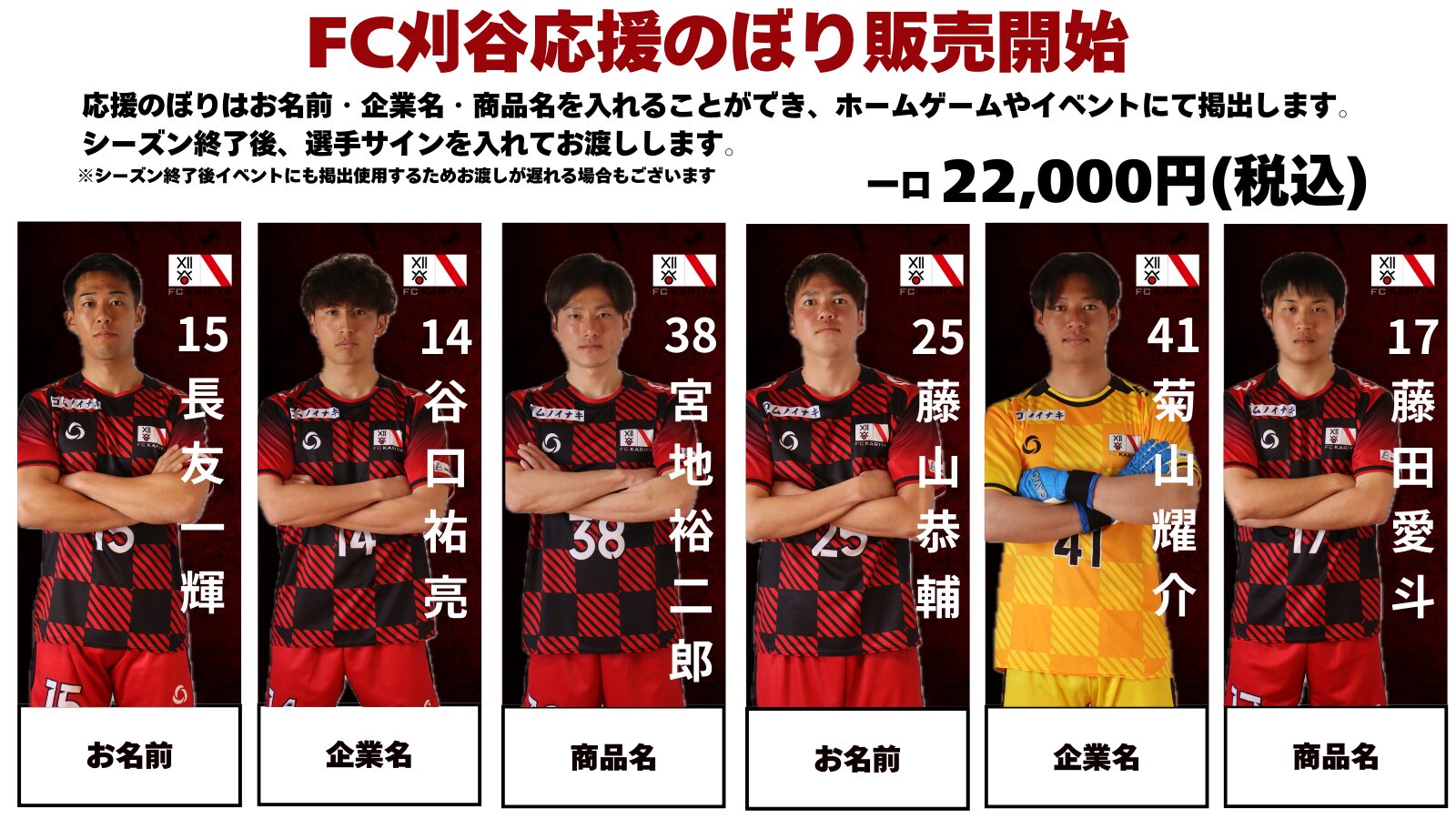 FC刈谷オンラインストアにて【FC刈谷応援のぼり】選択し、希望選手・監督と記載するお名前または社名または商品名を備考欄にご記入ください。